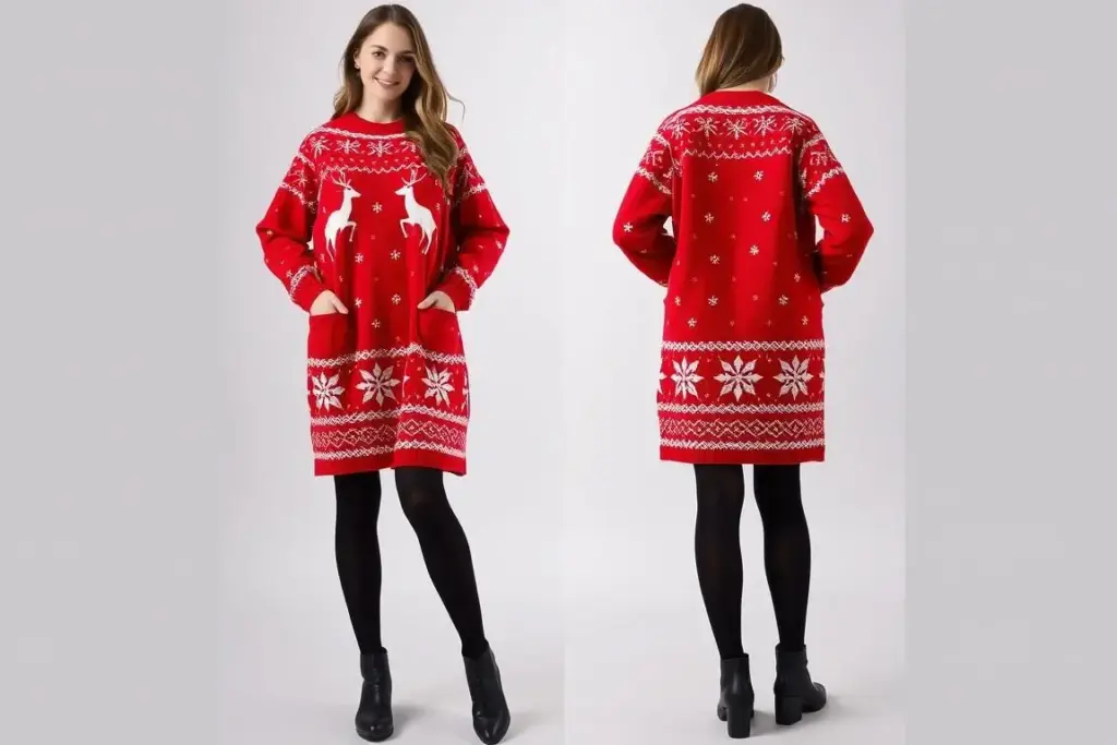Holiday parties, Christmas shopping, and casual festive gatherings. Pair with thick tights and boots for a complete winter look that’s both comfortable and stylish. Add a belt to define the waist for a more structured silhouette.