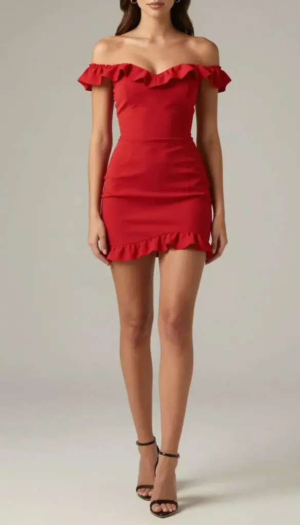 For a more playful Valentine Day outfit, an off-shoulder mini dress in vibrant red creates a flirty yet sophisticated look. The shoulder-baring style adds a touch of romance while the shorter length shows off your legs.