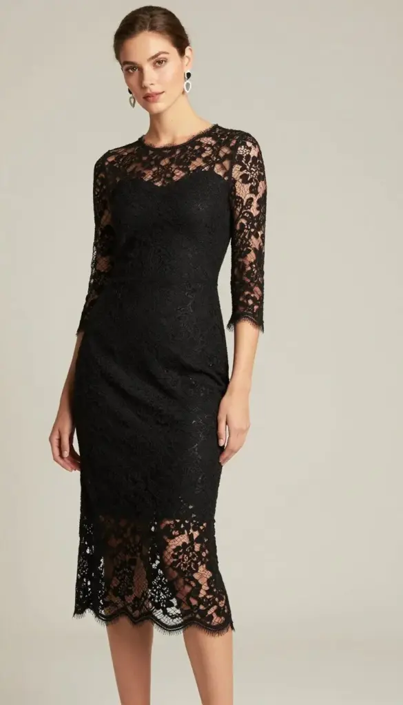 A black lace midi dress combines timeless elegance with romantic details, making it a sophisticated choice for Valentine’s Day. The intricate lace overlay adds texture and visual interest while the midi length maintains a refined silhouette.