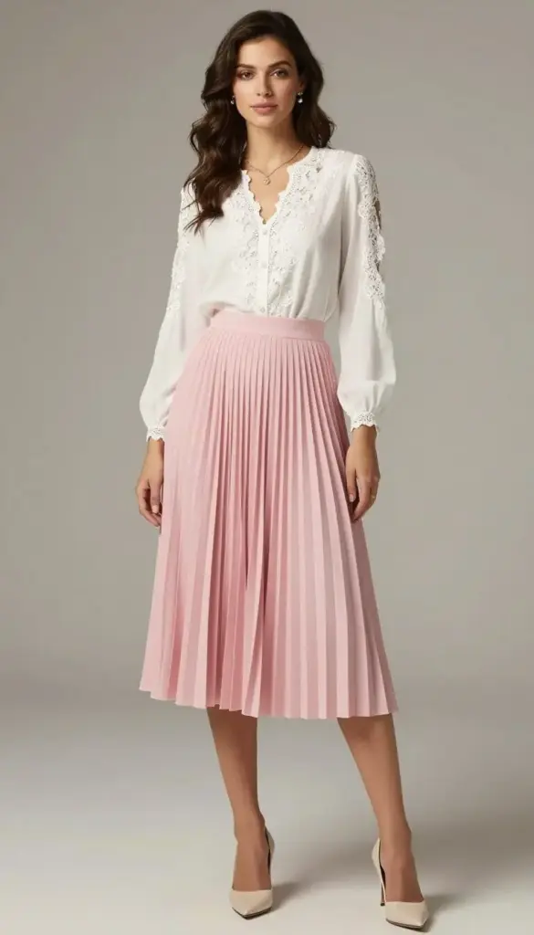 A white lace-trim blouse paired with a pink pleated midi skirt offers a romantic yet versatile Valentine Day outfit. This feminine combination provides a softer alternative to dresses while maintaining an elegant aesthetic perfect for the occasion.