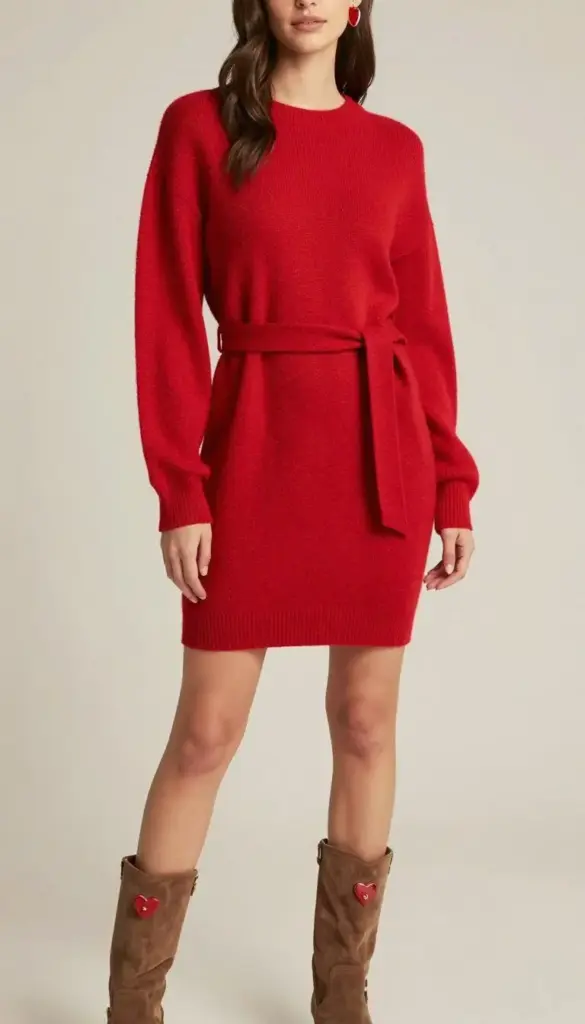 A red sweater dress offers both comfort and style for a casual Valentine Day outfit. The soft knit fabric provides warmth for February celebrations while the vibrant color embraces the Valentine’s spirit.