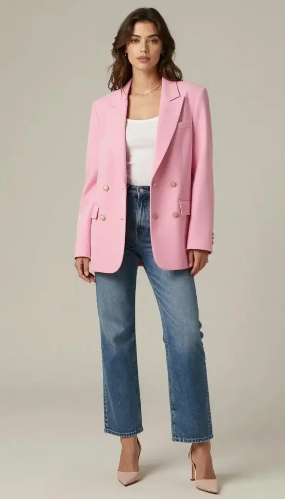 For a smart-casual Valentine Day outfit, pair a pink oversized blazer with well-fitted jeans and a simple white top. This combination strikes the perfect balance between polished and relaxed, ideal for casual dinner dates or Galentine’s celebrations.