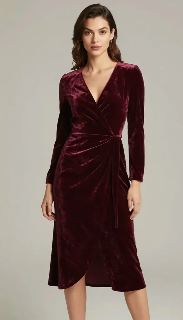 A burgundy velvet wrap dress combines luxury and comfort for an elegant Valentine Day outfit. The rich texture of velvet adds depth and sophistication while the wrap style creates a flattering silhouette for all body types.
