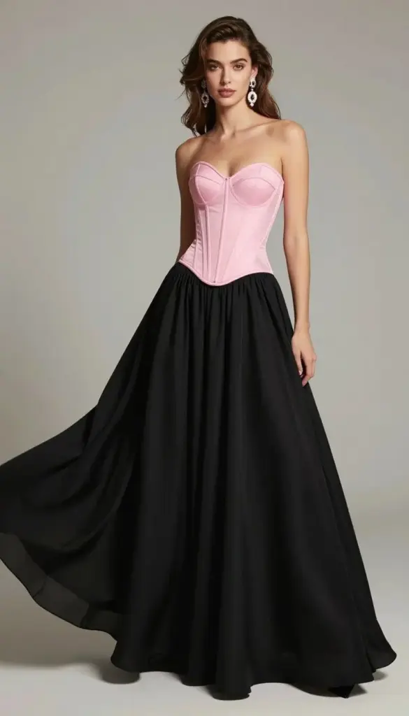 For a bold and romantic Valentine Day outfit, pair a structured pink corset top with a flowing black maxi skirt. This dramatic combination creates a stunning silhouette that balances structure with movement for an unforgettable look.