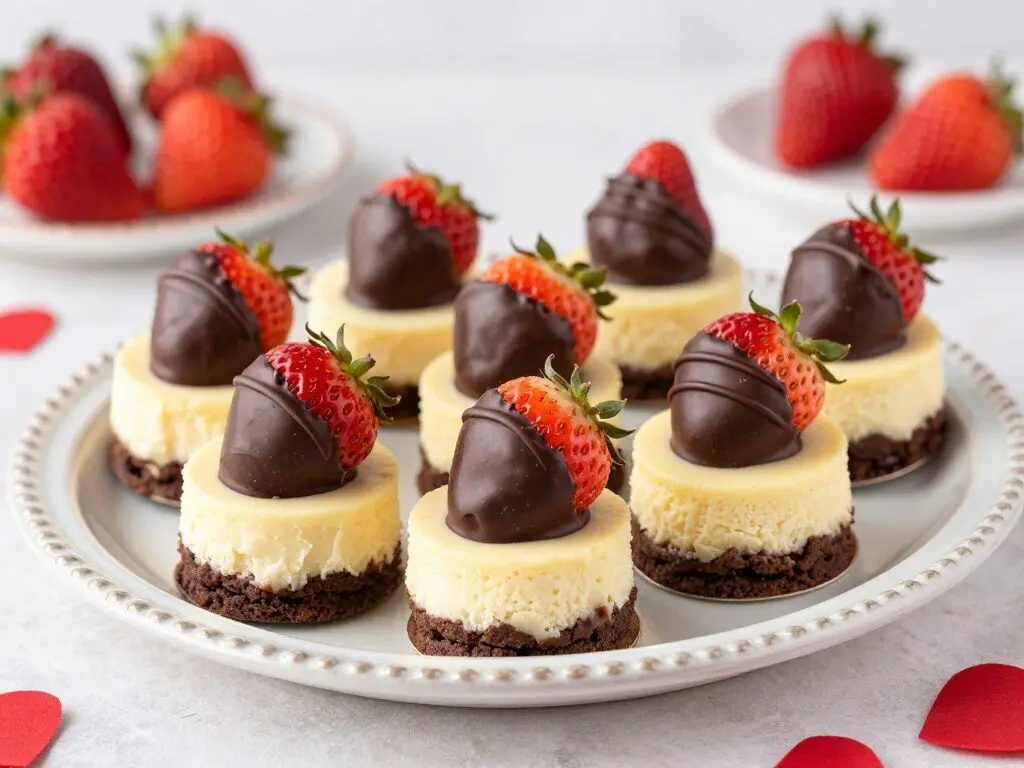 These individual cheesecakes combine two Valentine’s Day classics: creamy cheesecake and chocolate-covered strawberries. The mini format makes them perfect for serving at a Valentine’s Day gathering, while the chocolate-dipped strawberry topping provides both decoration and flavor in one beautiful package.