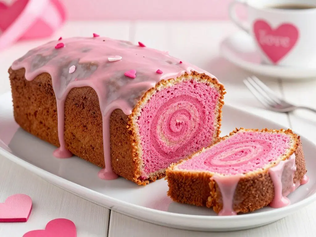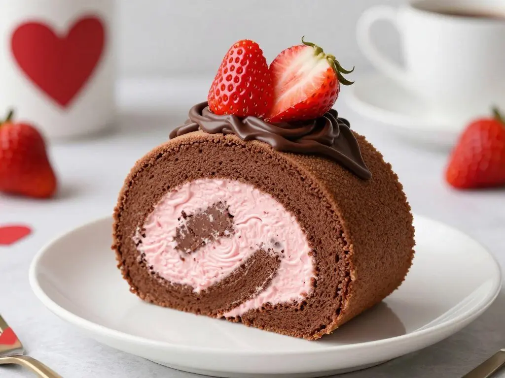 This elegant Swiss roll combines two Valentine’s Day favorites: chocolate and strawberries. The light and fluffy strawberry filling creates a beautiful spiral when sliced, while the rich chocolate exterior makes it irresistible. The natural pink color of the filling makes it especially perfect for a romantic celebration.