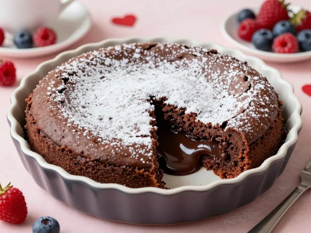 If you’ve been intimidated by individual lava cakes, this big-batch version is your perfect solution. It creates the same magical molten center but in a larger format that’s perfect for sharing. Topped with a dusting of powdered sugar and fresh berries, it’s an impressive yet approachable Valentine’s dessert.
