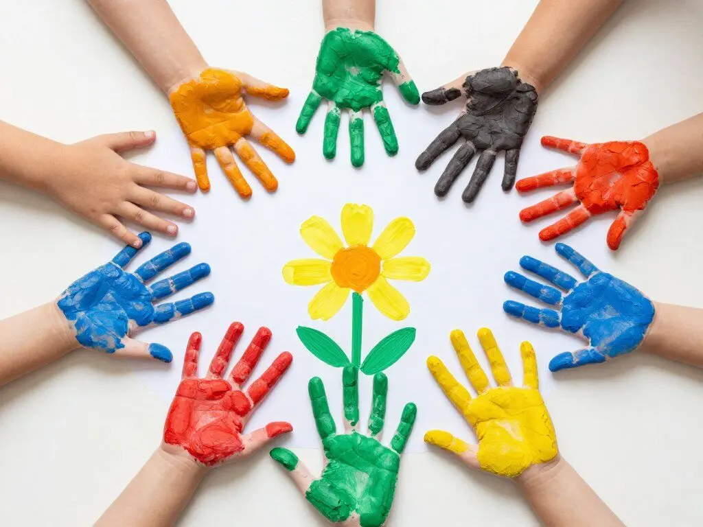 Paint each child’s palm and fingers in bright colors. Press hands onto white paper to create flower petals arranged in a circle. Use green paint for thumb prints as stems and leaves.