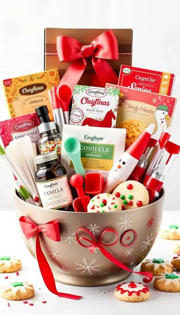Inspire sweet creations with premium baking mixes, vanilla extract, and decorative sprinkles. Include quality measuring spoons, silicone spatulas, and cookie cutters. A festive apron and specialized cookbook make this hamper perfect for the holiday baker in your life.