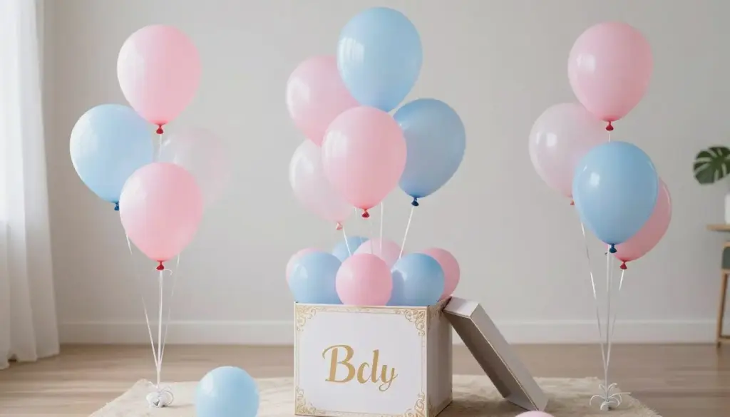 Place a pink or blue balloon in a cardboard box. Open it to reveal the floating balloon inside—simple, affordable, and effective.