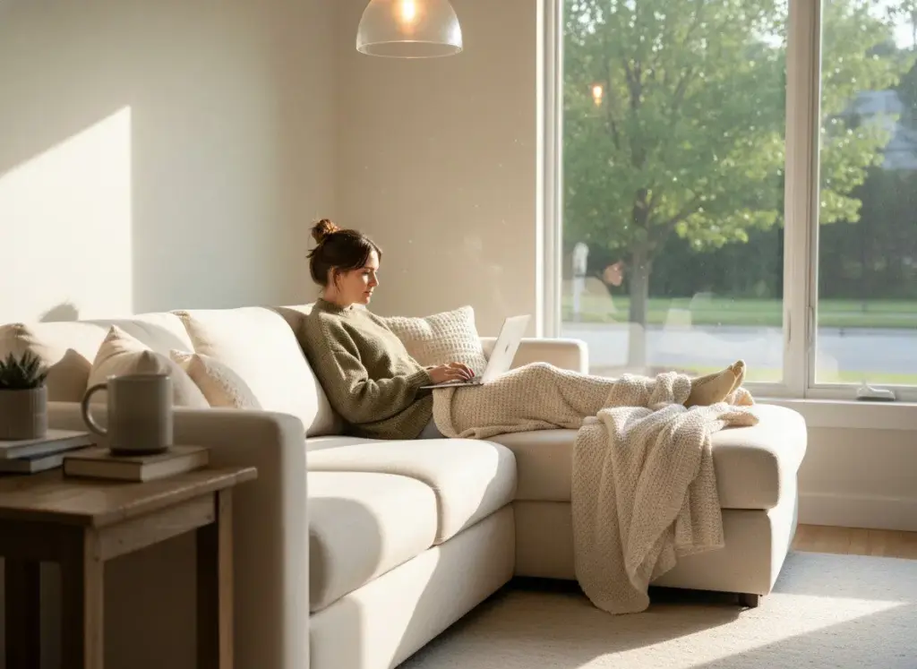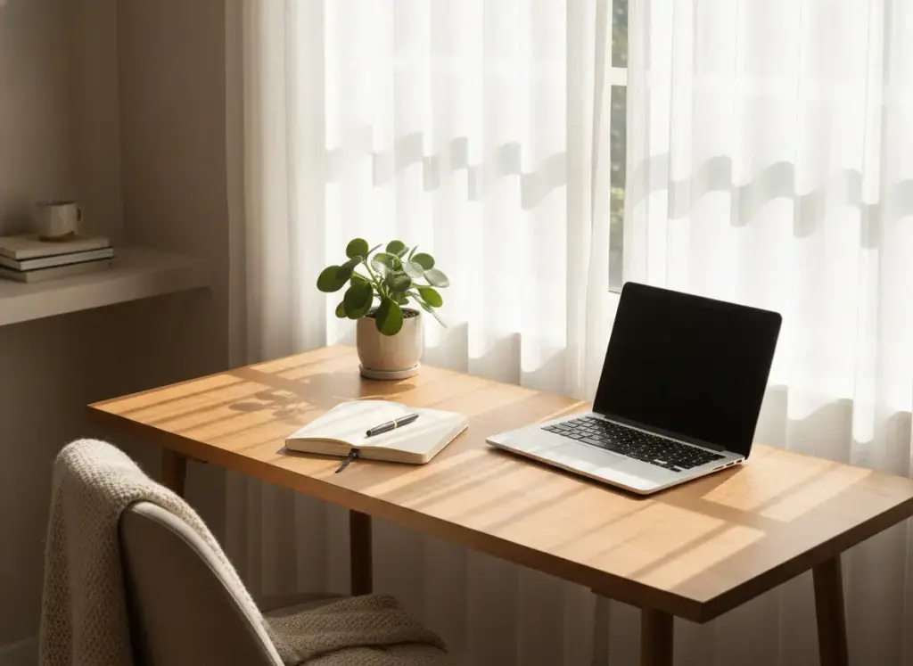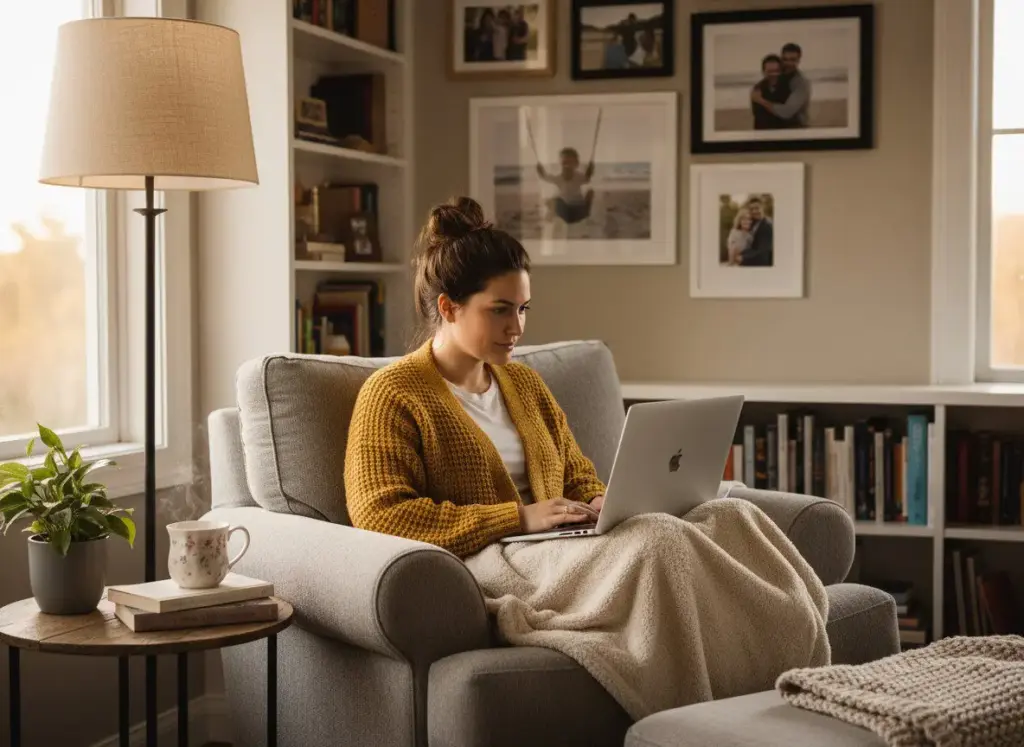 Lighting makes all the difference in cozy work photos. Position yourself near windows with sheer curtains for diffused natural light. Early morning or late afternoon golden hours create a peaceful glow that enhances the cozy atmosphere of your work-from-home setup.