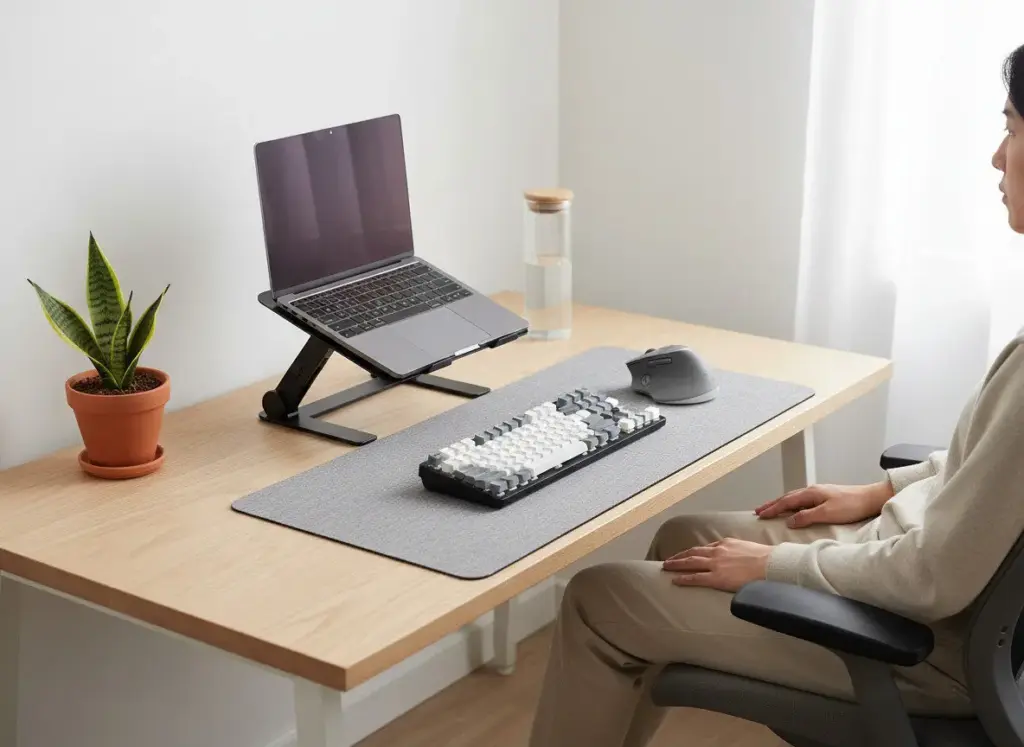 Showcase proper ergonomics by positioning your laptop on a stand to bring the screen to eye level. Include an external keyboard and mouse to demonstrate a comfortable typing position. These photos emphasize both productivity and physical wellbeing in your home office environment.