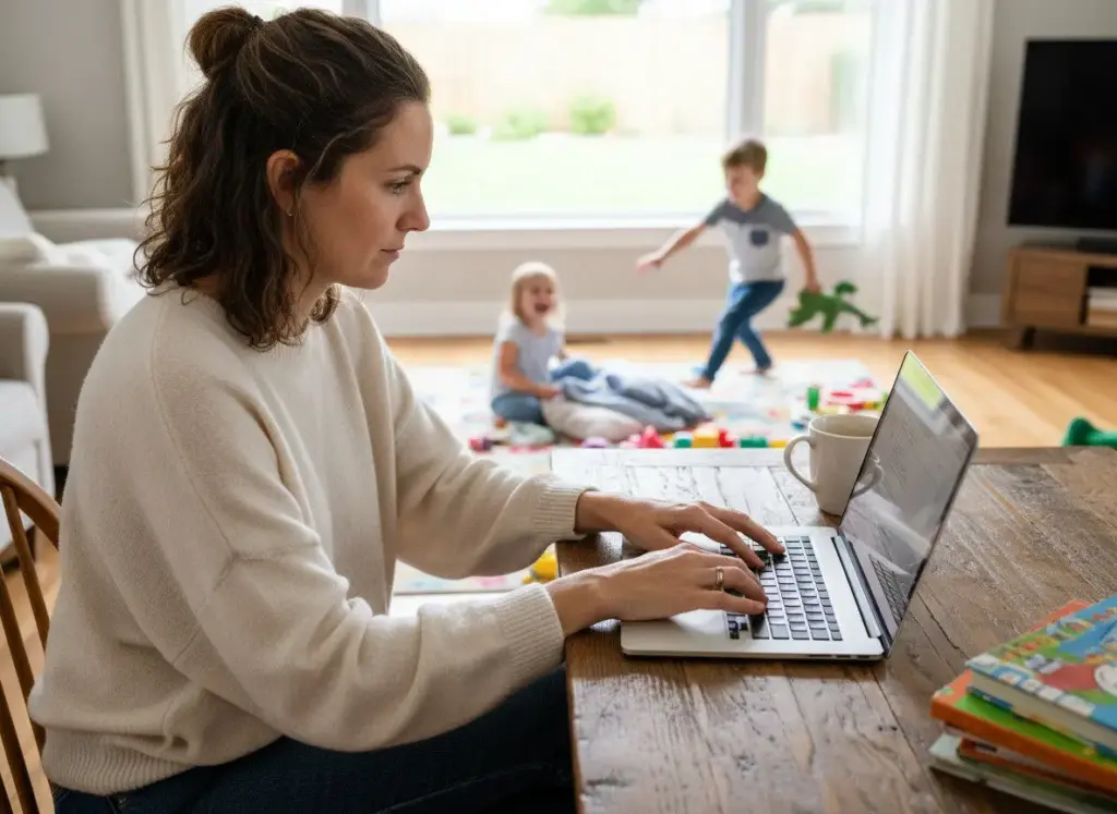 These authentic shots capture the reality of working parenthood. Position yourself at your workspace with children visible in the background-perhaps playing, reading, or engaged in their own activities. The key is capturing both focus on work and awareness of your children.