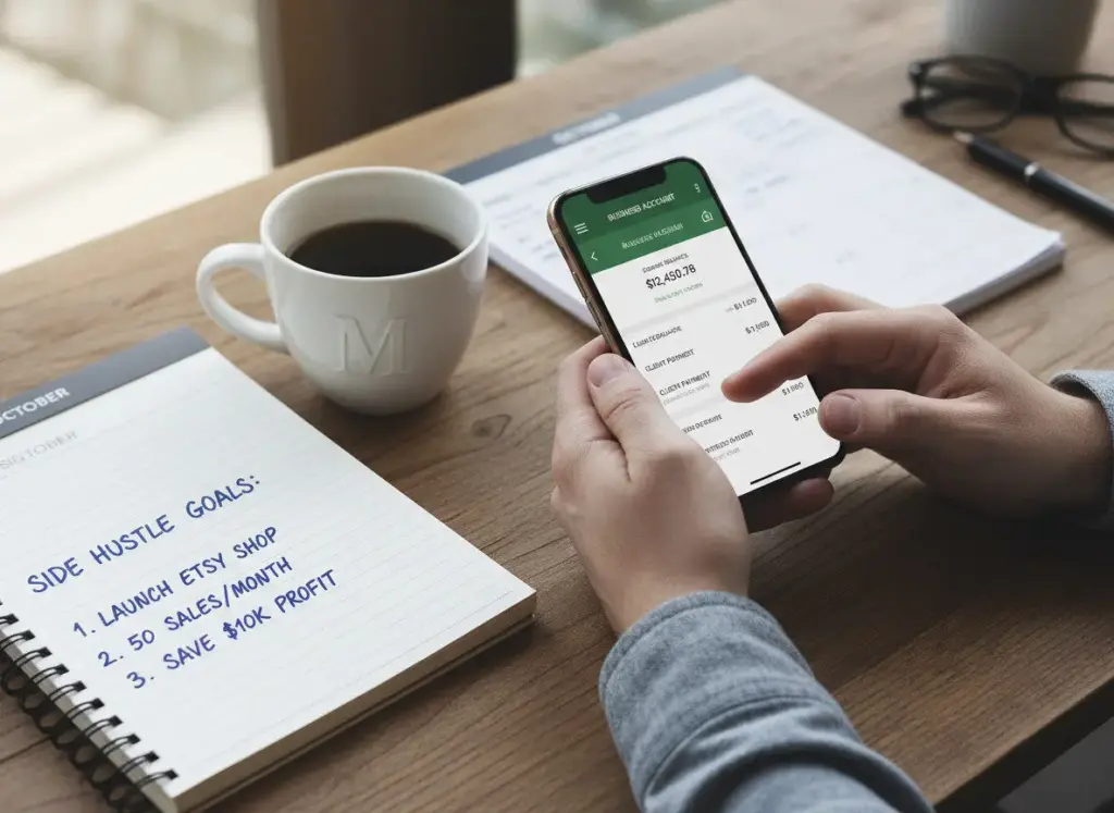 Many side hustles start and operate entirely from a smartphone. Capture close-up shots of hands using a phone for business activities-checking orders, responding to clients, or managing social media. Include elements like a notebook with goals written down or a planner to show the intentionality behind the hustle.