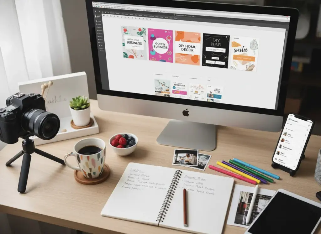 Content creators can showcase their work process through photos of Pinterest pin design, blog writing, or social media content creation. Include elements like a content calendar, design software on screen, or photography equipment. These images highlight the creative and strategic aspects of digital entrepreneurship.